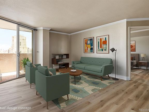 Captivating 7th floor Denver skyline views and a clean design slate are waiting for you with 2 GARAGE SPACES, only a few blocks from Santa Fe Art District. Offering a haven of comfort and convenience, this residence boasts two bedrooms and two full baths, complemented by the luxury of a rare in-unit WASHER & DRYER. Start your days with mile high city views and coffee on your covered balcony. After a day in the mountains, hot tub under the stars on the INCREDIBLE 9th floor west roof deck. STELLAR AMENITIES: 6 ROOF DECKS, 2 fitness centers, business hub, private movie theater, cozy lounge/party room with bar + fireplace. Pamper your furry friend at the fenced dog park, or take a refreshing dip in the gorgeous seasonal outdoor pool. Elevate your relaxation and connections on the multiple rooftop decks, which feature hot tubs and breathtaking mountain panoramas. These are wonderful gathering spots for friends to admire colorful mountain sunsets, before strolling over to Santa Fe Arts District... teeming with galleries + food trucks on First Fridays! Immerse yourself in the cultural tapestry of Denver, with nearby Golden Triangle attractions like the Denver Art Museum (new wing by architect: Daniel Liebeskind), Denver Central Library (architect: Michael Graves), Kirkland Museum and Clyfford Still Museum. With a King Soopers grocery store conveniently located a block away, your daily essentials are effortlessly within reach. This home includes brand new laminate flooring throughout + TWO COVERED GARAGE SPACES + storage unit. Seize this opportunity to craft your perfectly creative life here! Seller is offering generous credits to facilitate your journey into this mile-high haven. Discuss credits toward rate buy down/discount points -OR- 12 months of future HOA dues. Are you ready to make this spacious condo your new urban sanctuary? Long term rentals and pets are allowed. Buyer agent to verify all rules/regs and guidelines.