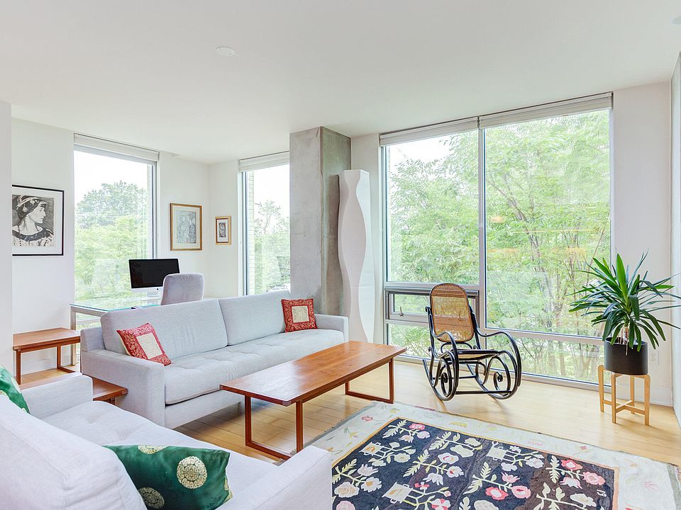 Worship worthy green(bridge) goddess. Craft and materiality establish this home's soulful spirit and create serene living in the ultimate downtown location. The relaxed, elegant yet functional environment is appointed in designer curated finishes. Floor-to-ceiling windows embrace big views and fill the rooms with natural light. Dual shades are at the ready for cocoon-time or filtered light comfort. Maple hardwood floors connect the living areas and have been extended throughout the hallway and bedrooms. A clever coat-cabinet addition offers just-right storage in the entry. The flex room, with a frosted glass-panel sliding door, is ideal for a home office, hobby, or yoga studio. An open sweep of living, dining and kitchen spaces enable mixing and mingling. The larger-than-life living room windows wrap two sides of the room and frame lovely foliage bringing the outdoors in. Stylish and well-equipped, the open kitchen has eco recycled-glass aggregate countertops; a large island with space for ample seating; tile splash; pullout cabinet shelves; some opaque glass front cabinet doors; and under cabinet lights supplement sleek pendant task lighting. Stainless steel appliances include a Bosch 4-burner gas range, dishwasher, and microwave drawer; Faber range hood; and new LG refrigerator. Bedrooms are well-separated from living areas. The primary bedroom has two walls of windows; built-in shelving; a zen ensuite bathroom; and walk-in closet featuring custom built-in shelves and drawers. The two bathrooms offer tranquility courtesy of a restful palette of countertops; cabinetry; tile floors; a glass enclosure for the tiled shower in the primary bath; and shower/tub combo with crisp white ceramic tile in the hall bathroom. Greenbridge has exceptional sound insulation. You can rest assured that sound doesn't travel in this building. Just a few steps from your door, via the newly painted and carpeted hallway, the picturesque second-level outdoor terrace invites you to all the calm of morning coffee in the garden without any of the maintenance. The ease of second floor living allows for elevator and stair access, so you can quickly pop out for a run or to walk the dog. The laundry has a Bosch washer and dryer, or you may use the free commercial-sized machines in the Greenbridge laundry facility for those larger items. 212 includes one parking space on the locked lower parking deck, which also offers secured bicycle storage. A helpful concierge on duty during office hours greets service providers and guests while security comes from fob-controlled entry to the building at other times. Collect your letters and packages in the mailroom off the lobby and take advantage of the twice-weekly collection and delivery of your dry cleaning. Meet with friends in the newly re-furnished Sky Lounge, terrace, and the multimedia theater or reserve them for private gatherings. A well-appointed gym supplements strolling on a scenic walking trail that begins less than half-a-mile away and leads to the Community Center on the other side of town. Walk, bike, or drive less than one mile to the UNC campus. And of course, you are surrounded by a choice of fine restaurants, bars, and cafes within walking distance. For more details on the perks of Greenbridge living, please visit www.greenbridgeuoa.com.