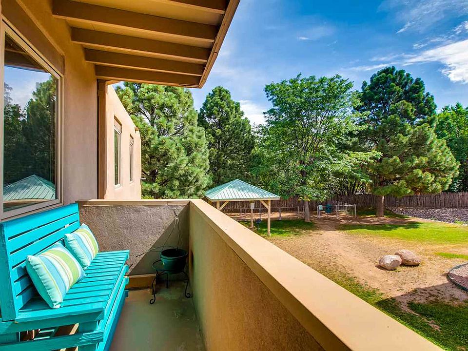 Currently the lowest priced condo in the San Mateo Condominiums!! Tucked away in the back peaceful corner of the San Mateo Condo complex, far away from two busy Santa Fe streets (St Francis Drive and San Mateo) is this well maintained second story condo with a balcony patio that overlooks the serenity of trees and grass. New water heater was installed in 2017. Brand new carpet. was recently installed in 2018. New coat of paint was completed on 1/21/2019. The San Mateo Condos is a very centrally located condo complex with swimming pool, work out room, on-site management, manicured grounds, and assigned parking spaces. Condo dues include roof (schedued for replacement this year -2019) in Building 8) and stucco maintenance, grounds keeping and parking lot upkeep among other items. Tenant moved put 1/1/19, so now very easy to show!!