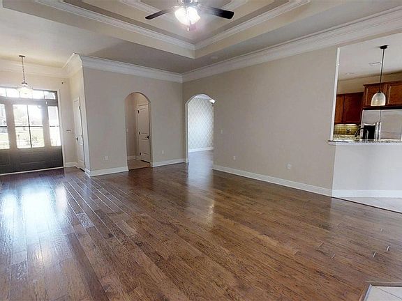 This lovely and spacious upgraded home is currently the only Jamison floorplan available with the extra bonus room above the double car garage! The main level of the home features the master suite w/ a recently built walk in closet in the master bathroom, built in closet system, double vanity & granite counter tops, corner tub, & separate walk in tiled shower; full guest bathroom, half bath and large utility room; the huge living area features wood flooring, double sided fireplace w/ remote, and decorative arched doorways which lead to the formal dining area and sun room/den which offers plenty of natural light! The kitchen features a separate breakfast area & bar seating, stainless steel appliances (microwave and gas stove recently installed), granite counters, updated kitchen backsplash and large pantry. The sunroom leads out to the recently screened outdoor patio which includes a kitchenette area and built in Green Egg grill and stainless steel mini-fridge. The fenced backyard has a double gate and contains a newly built 400 sq.ft. storage building w/ electricity. Stairs lead up to a 300 sq.ft bonus room w/ walk-in closet. Other upgrades include wood flooring, gutters, well for sprinkler system, ceiling fans, landscaping, brick lined driveway w/ extended drive fro 3rd car, custom blinds, coded front door lock, and extra insulation.
