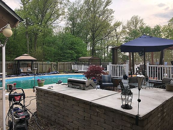 A wooded back drop full of beautiful mature trees encompasses this lovely ranch on a finished basement. This home boasts newly remodeled kitchen and bathrooms, as well as a privacy-fenced in ground pool area. Multiple outside living areas surrounded updated pool with built in grille and hot tub. The GFA (in attic) is new in '18. With a spacious sunken living room that has a ceramic fireplace, you can't go wrong with this gem of a home!