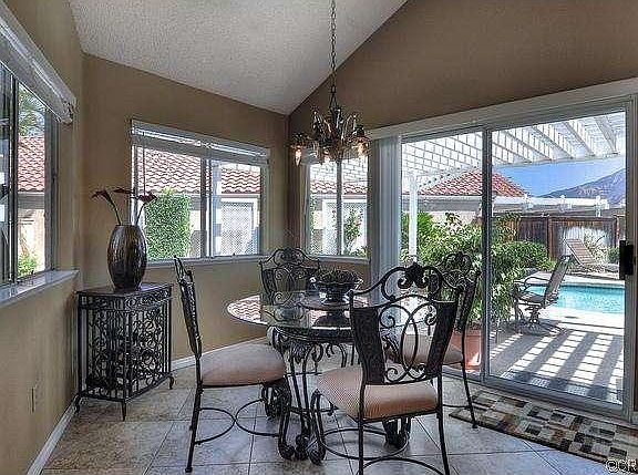 Gorgeous single-level story home. Upgrades include lighting in kitchen, tract lights in living room, porcelain travertine flooring, laminated flooring in bedrooms, master shower upgraded, vanity in master bedroom with granite counter tops. Open floorplan, 3 bedrooms, 2 bathrooms. 1 bedroom is currently used as an office. Master bedroom with french doors that lead to the backyard. Large yard with private in-ground pool and jacquzzi. Cozy fireplace in living room. Surround sound speakers in every room and outside patio. Custom built-in wet bar with mirrors and glass shelving in the living room. Beautiful Spanish fountain. Mountain view. Located on a cul-de-sac.