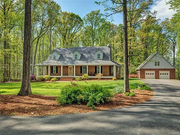 GORGEOUS ALL BRICK CUSTOM CAPE NESTLED ON A PRIVATE LOT IN POWHATAN W/ FIRST FLOOR MASTER & OVERSIZED 2.5 DETACHED CAR GARAGE! Brand new granite counter tops and master bathroom renovation! Featuring hardwood floors throughout first floor, stunning vaulted living room & huge rear patio. Set back from the road, a picturesque wrap around front porch welcomes you. The kitchen is set up perfectly for the chef of the family - w/granite countertops, bar-seating, pantry & bright & sunny breakfast nook! Dramatic family room offers breathtaking vaulted ceiling, floor-to-ceiling windows & stunning stone FP. 1st floor master BR features HDWD, huge WIC & recently renovated ensuite bath w/oversized vanity. Upstairs, find a spacious loft & additional 2 BR, each w/WIC's, & recently updated shared bath. Don't miss the unfinished walk-up 2nd floor above detached garage w/additional attic storage above - could be finished into awesome man cave or guest suite! Sitting on an expansive 2 acre lot, home also offers HUGE rear aggregate patio providing the ultimate space for enjoying the peace and quiet of country living! This home has it ALL! Additional acreage available - ask listing agent for details!