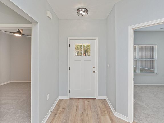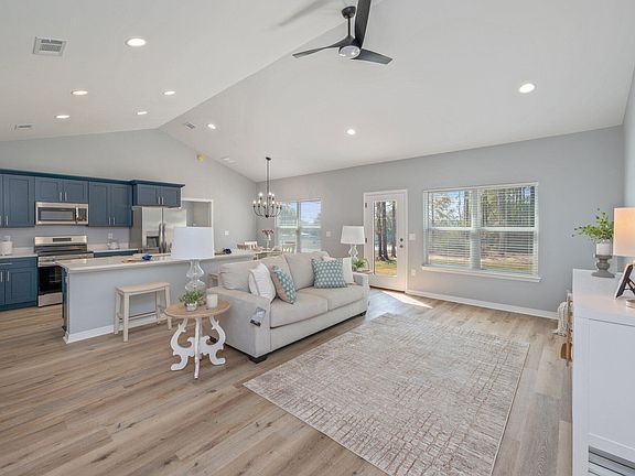 Welcome to this quality built 4-bedroom, 2-bathroom customized home, showcasing an open floor plan and a functional use of space. The builder is offering a $10,000 contribution toward BUYER'S CLOSING COST w/ the use of builder's preferred lender, and as an added bonus, has installed blinds throughout the home and a side-by-side refrigerator. The common area features cathedral ceilings, creating a sense of openness. The kitchen boasts rich blue cabinets, providing a striking contrast to the walls and quartz countertops. The kitchen is fully equipped with appliances, including refrigerator, and features an oversized island with farm sink. The master suite is complete with a treyed ceiling and bathroom, featuring a dual vanity, soaking tub with separate shower, and walk-in closet. Split bedroom design offers added flexibility. The rear guest bedroom features a French door leading out to the 27' x 8' patio as does the living room, perfect for outdoor entertaining. Even better - there are no HOA fees!! Both the residence and location offer a unique combination of style, convenience, and affordability. Room dimensions and lot size listed here are approximate. Buyer to verify all areas of importance!