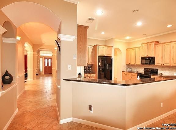 Four bedroom, 2 bath, one story, custom-built home. Features 12 foot ceilings, decorative art niches, granite counter tops, 20 inch tile floors and arched entry ways in main areas; crown molding in living, dining and family areas with spacious 42 inch custom cabinets. Open family room, with gorgeous stone fireplace. Covered patio facing the beautiful park-like back yard with lots of privacy. Tray ceilings and fans in all bedrooms. This home is perfect for families that want a quiet, soothing retreat.