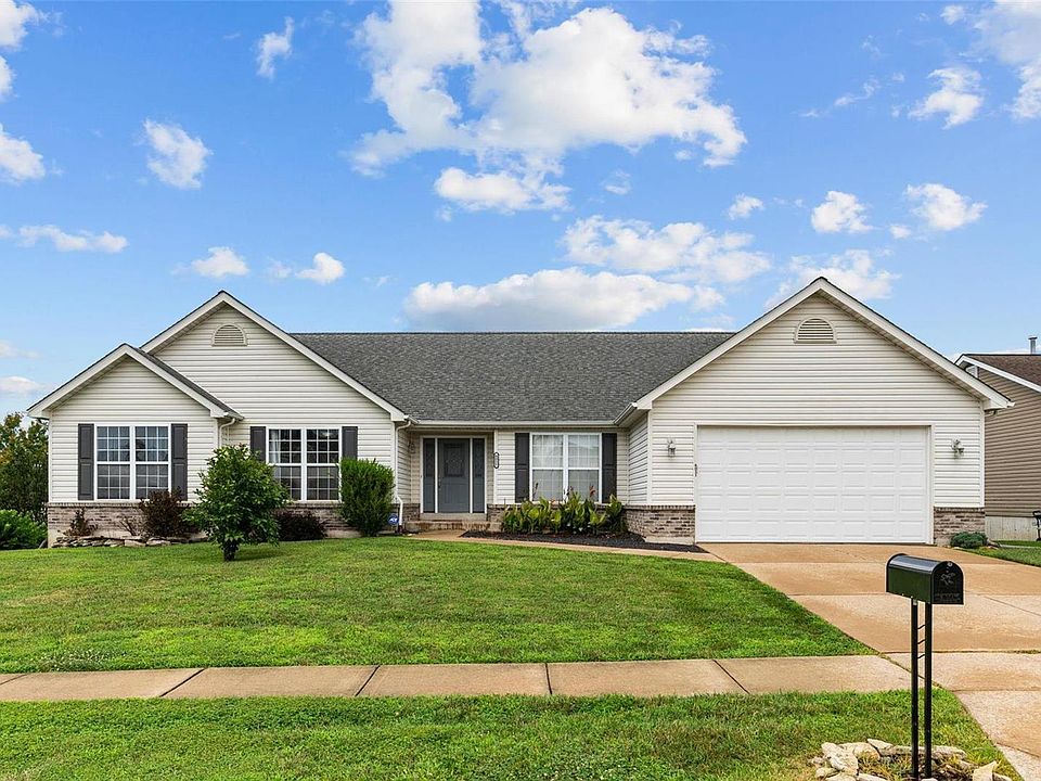Look no further than this spacious ranch in Wentzville with over 2,300 sq. ft. of living space! You'll have wonderful curb appeal, with brick accents and great landscaping leading to the beautiful leaded glass door. From the foyer, the bright living room greets you. It features a woodburning fireplace with shiplap surround, flanked by picture windows. The kitchen boasts stylish lighting, cabinets w/crown molding, large breakfast room, and ceramic tile floors. The primary suite has walk-in closet and bath w/jet tub and step-in shower. Three more bedrooms, another full bath & convenient laundry room complete the main floor. The walk-out, finished LL adds a 5th bedroom, family room and bath w/step-in tile-surround shower, plus plenty of storage space. 3-car garage has its own exit to the backyard. Enjoy summer on the deck overlooking the patio and fenced yard. Amazing community w/pool, clubhouse, stocked lakes, walking trails & sports fields, moments from all that Wentzville has to offer!