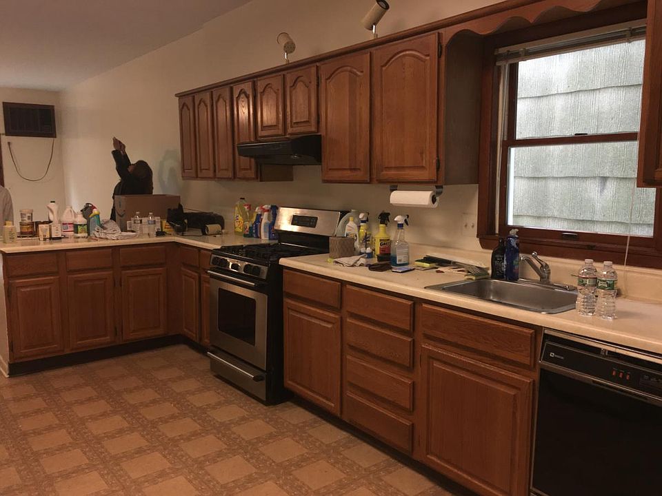 Three bedroom apartment, two bedrooms on the first floor, additional bedroom in the basement. Carpeted bedrooms, big, open kitchen.