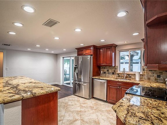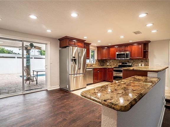 Come and see this 3 bedroom, 2 bathroom recently updated pool home. It is ready for immediate occupancy. Upgrades include vinyl plank flooring, fresh paint, new 6 panels doors, light fixtures, exterior sliding glass doors, windows and blinds. Granite cabinet tops in the kitchen with a breakfast bar overlooking the sunken living room. The master bedroom is complete with a en-suite with large cabinet and new sink, walk in shower and closet. For your privacy a new barn door has been installed. Bedroom #2 and #3 share a remodeled hall bathroom. The back yard boasts a large swimming pool, pavers and is completely fenced with PVC fencing. Close to schools, shopping, beaches and the Suncoast Parkway. Remediation Completed 2010 Engineering Report Available. This home has it all. Make your appointment for your personal tour.