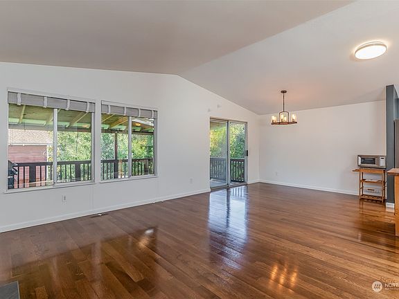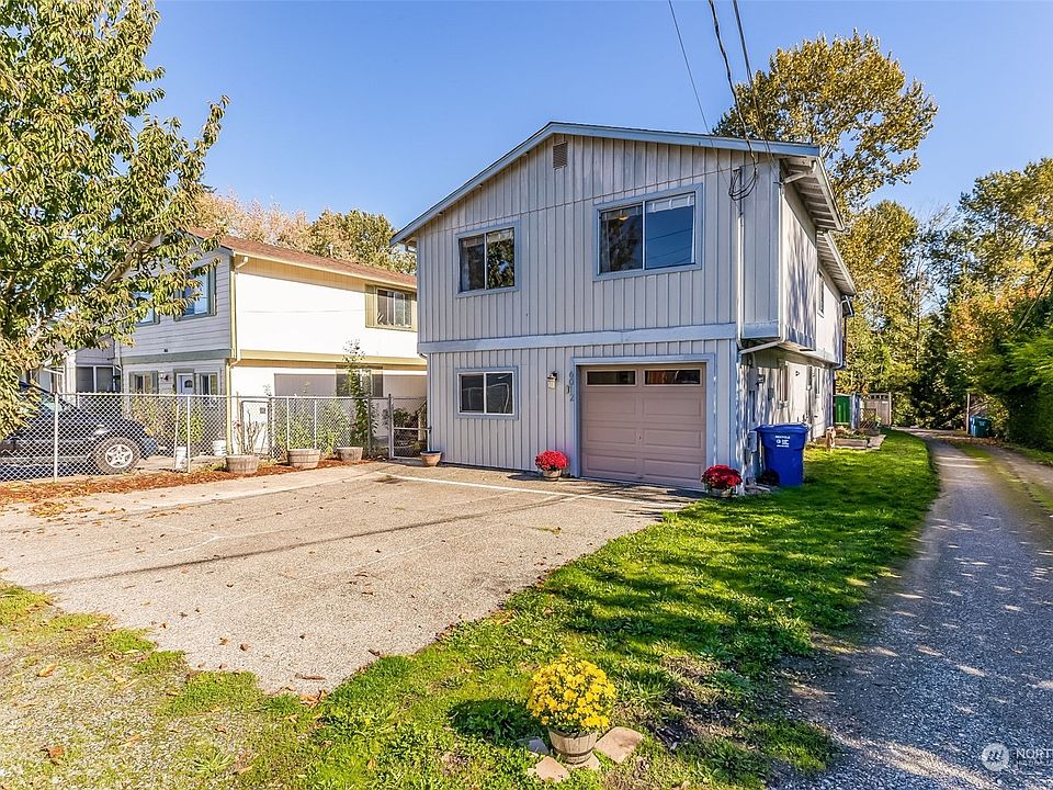 Come see this lovely split-entry home! Upper level features newer hardwood floors, updated open kitchen with a deep single sink, dining and living room areas, wood-burning fireplace, a full bath and two bedrooms. Primary suite on upper level has another full bath. Primary bedroom closet is cedar-lined. Good-sized covered deck off dining area is great for storage or year-round access to your BBQ grill. Lower level has a separate entrance, a second kitchen and potential sleeping area for multi-generational living. Garage space has an office space and a 'gear room' for storing sporting gear. Great for WFH! Fully-fenced yard has raised garden beds & shed for gardening and yard tools. Quiet close-knit neighborhood. Walk to Rapid Ride bus H Line.