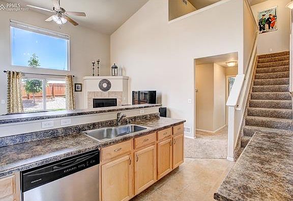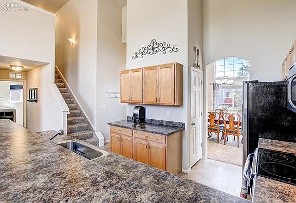 Immaculate and move in ready! Well maintained by one owner! Great for guests w/ formal dining room which attaches kitchen! Kitchen boasts SS appliances, deep single basin sink & huge breakfast bar! Sunny walk out living leads to rear patio w/ Pikes Peak views! Plus raised garden beds, auto sprinkler & fire pit! Main level master attaches 5-piece & WIC! Laundry/mud room with garage entry on main! Finished basement has stained concrete floors, office w/ french doors & WET BAR! New roof with transferrable warranty! Come See! Ample storage throughout with kitchen pantry, lots of cabinetry, basement storage closets and walk in closet in every bedroom! Every level has a bathroom and bedroom! Conveniently located off Powers in quiet neighborhood, quick drive to bases! Come see today! 5th Bedroom in basement is non conforming as it does not have a closet.