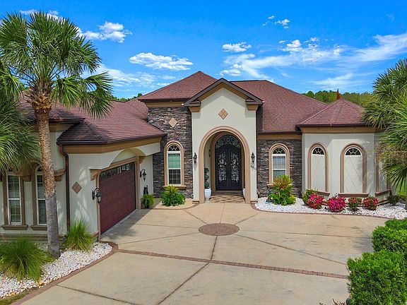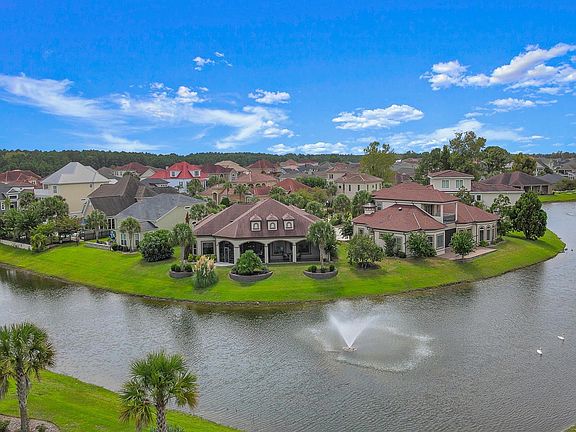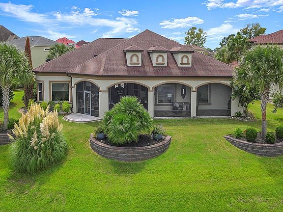 This stunning Mediterranean-style four-bedroom, three-bath lakefront home is nestled in the prestigious, gated community of The Bluffs on the Waterway, located on a peaceful cul-de-sac. Inside, the home boasts elegant porcelain tile floors throughout, arched doorways, double tray ceilings, and two cozy fireplaces. The gourmet kitchen features custom cabinetry, granite countertops, a breakfast bar, upgraded Electrolux Icon Series stainless steel appliances, and a walk-in pantry with custom shelving. The spacious great room, with built-in cabinetry and a fireplace, offers expansive windows that frame breathtaking lake views. The luxurious master suite includes a fireplace, double tray ceiling, and two large walk-in closets, while the master bath is a spa-like retreat with dual vanities, two linen closets, a soaking tub, and a grand 14 x 6 custom-tiled walk-in shower with multiple showerheads. Two additional guest bedrooms each have walk-in closets and en-suite baths with glass-enclosed, tiled showers. The office/den doubles as a fourth bedroom. The large laundry room provides ample storage with built-in cabinetry and a utility sink. Step outside to a covered, screened-in porch with tile flooring, built-in cabinetry, and a real hardwood ceiling with ceiling fans. The expansive 25 x 23' lanai is perfect for entertaining, featuring a custom outdoor grill, sink, beverage cooler, and stunning views of the lake’s fountain. Professionally landscaped grounds, landscape lighting, and energy-efficient features such as surround sound, three-zone heating/cooling, two Rinnai tankless propane water heaters, and closed-cell insulation ensure year-round comfort. The Bluffs offers exclusive amenities, including large outdoor pool, 2 clubhouses, private boat storage and launch, boat day dock, tennis, pickle ball, basketball area, a children's play area, and a grand entrance, all within the top-rated Carolina Forest school district and close to Myrtle Beach's beaches, airport, restaurants, and entertainment.