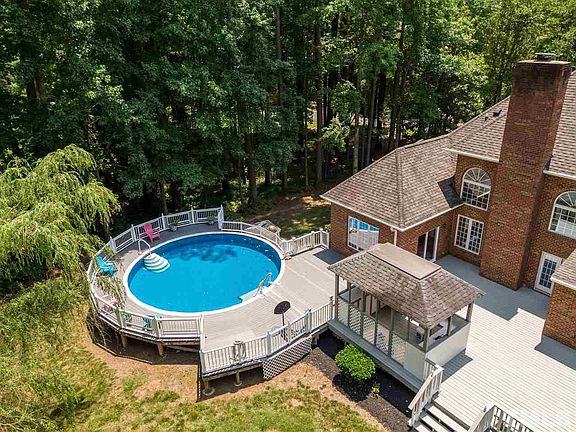 Looking for a custom home w/4 car garage + apt over garage, multi-generational, 1.8 acres of serenity? Four BR in main house + above stand alone garage w/ kitchen, bath, LR & BR/office + large private covered deck. Hardwoods, formals, new paint, new carpet, above ground pool, all sided brick, 1st fl master, sunroom off master could be ofc dual staircases, gas cooktop, double ovens, trash compactor, loads of natural light. Close to downtown Raleigh, parks, grocery stores, shopping. $7000 frig