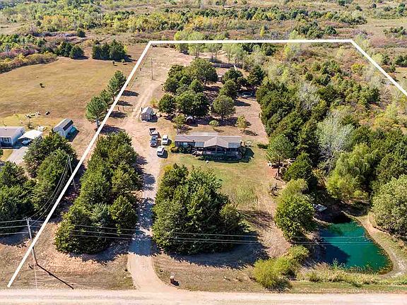 Nestled on a serene 5-acre lot filled with mature trees, this charming property offers the perfect blend of tranquility and practicality. A stocked fishing pond adds to the idyllic setting, while a large deck overlooks the front yard and pond area, providing a peaceful retreat to enjoy the outdoors. The fenced backyard is ideal for pets or a play area, and the numerous garden spaces are ready for your green thumb. The 2007 Solitaire home sits on a permanent foundation and boasts a unique layout with two spacious bedrooms, one on each side of the house, and a central living area. Originally a three-bedroom, two-bath design, it can easily be converted back if desired. Outside, you'll find 2 storage sheds, a chicken coop, a detached two-car carport, and a storm shelter for added peace of mind. This property is a perfect blend of rural charm and modern comfort, offering endless possibilities for country living.