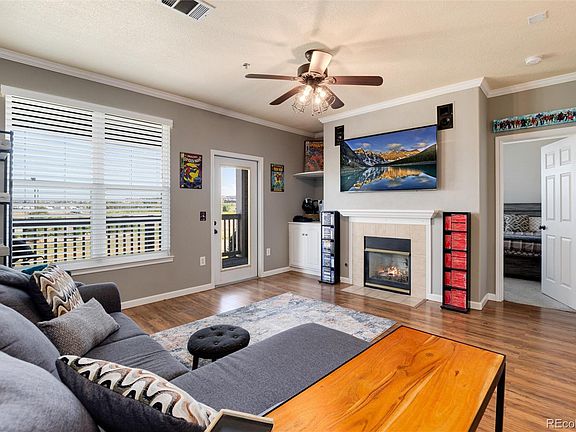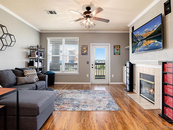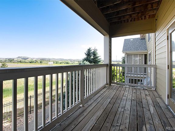 Beautiful sunlit second-floor Castle Villas condo located just a short stroll away from the Castle Rock Promenade and Outlet Mall. Enjoy stunning southwest views of Quarry Mesa from both the deck and the owner's suite, creating a picturesque backdrop for everyday living. Both bedrooms feature spacious walk-in closets, providing ample storage space for your belongings. The owner's suite boasts an en suite bathroom with dual sinks for added convenience, while the second bedroom offers direct access to the hallway bathroom. The kitchen is a chef's dream with newer cherry wood cabinets and lovely granite countertops creates a modern and inviting space to cook and entertain. The living area showcases newer gorgeous wood floors and new interior paint enhancing the overall charm of the unit. Take advantage of the pre-installed TV mounting above the gas fireplace, complete with mounts, speakers, and plug-ins for easy setup. Relax on the deck and soak in the breathtaking sunsets and annual fireworks display right from the comfort of your own home. With proximity to the Promenade and Outlets at Castle Rock, King Soopers, 24 Hour Fitness, Whole Foods as well as a variety of coffee shops, restaurants, and bars, this condo offers a prime location. Residents appreciate this low-maintenance lifestyle...HOA includes grounds and structure maintenance, trash/recycling, show removal, water/sewer and building insurance. New furnace in 2021. Detached garage conveniently located just outside the building...#66. Don't miss the opportunity to make this turnkey home yours and start enjoying the vibrant community and amenities just steps away from your front door.