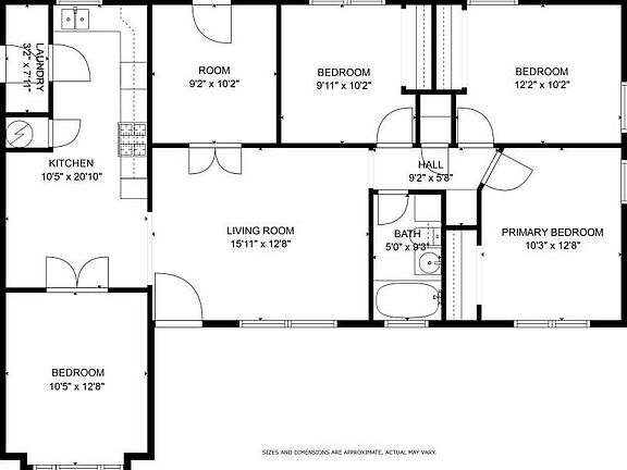 Four bedrooms include a bright primary retreat, while the fully updated bath features classic white tile, black cabinetry, and sleek finishes.