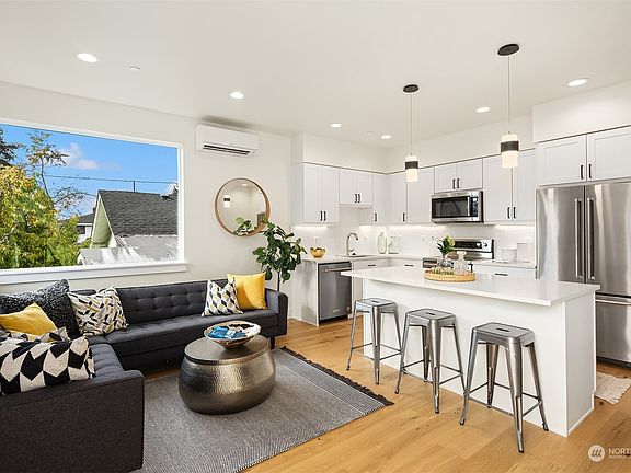 Discover your dream home in this thoughtfully designed new construction by local award-winning green builder Modelremodel. Located just minutes from the waterfront, this residence blends sleek modern style with eco-conscious craftsmanship. Enjoy an open floor plan with custom cabinetry, high-end stainless steel appliances, and engineered hardwoods. Oversized windows fill the space with natural light, while the west-facing rooftop deck offers panoramic views of the sound and mountains. Spacious bedrooms boast built-in closets and spa-like ensuites. Mini-split heating/cooling, upper-level laundry (washer/dryer included), off-street parking with EV add convenience and value. Built Green 4-star certified—don’t miss this exceptional home!
