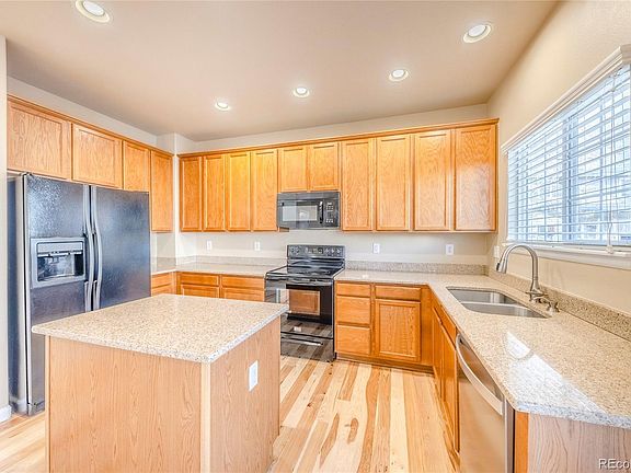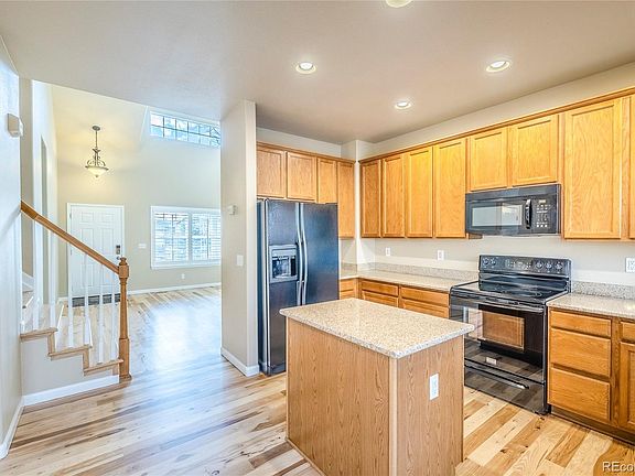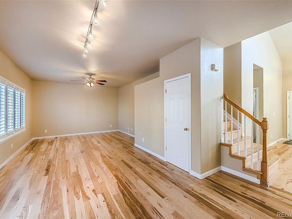 Pristine 5 bedroom, 3 bath two story home in Creekside at The Farm on a HUGE 7,500sf lot. Move-in ready with quick possession! Beautiful hickory pecan floors throughout the main level as well as the master bedroom. Bright vaulted living room, spacious kitchen with center island, granite counters and tons of cabinet space. Open floor plan between kitchen and family room for easy entertaining. Plantation shutters on the main level. Master suite has a private 5-piece bath with dual sinks and a his and her walk in closets. Garage and front door secured with smart locks. Cozy covered front porch, stamped concrete back patio, close to park, situated in cul-de-sac. 220 volt in garage for electric car charging. New roof and gutters in 2018. Unfinished basement with rough-in plumbing. Cherry Creek Schools. Great community amenities include trails, tennis and basketball courts and more. Close proximity to Trails Recreation Center. Must see!!