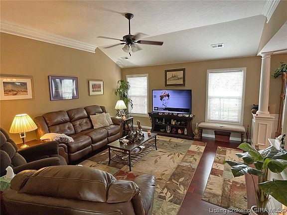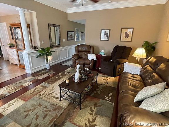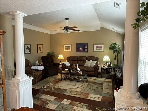 DON’T MISS THIS ONE! Beautiful 3 bed 2 bath ranch with upgraded trim. Open floor plan features living room with partial vault, engineered hardwood floor, open to kitchen and entry with wainscoting, coat closet and alcove for decorative item. Wainscoting extends down the hall to bedrooms. Kitchen features tile flooring, large dining area, pantry, breakfast bar, Formica tops with tile backsplash. Stainless appliances will remain and include refrigerator, dishwasher, electric range & microwave. Dining area has door to patio and back yard, laundry room has tile floor and entry to garage. The spacious Master has ensuite bath featuring large walk-in shower, vanity with cultured marble top and attached make up vanity, two walk in closets, tile floor. Master Bedroom has carpet, crown molding and ceiling fan. Two additional bedrooms have carpet and large single closets. Hall Bath has tile floor, single vanity and tub/shower combo. Two car garage with shelving that stays. Great location and neighborhood with Clubhouse, workout facility, large meeting room & pool. Greater Clark Schools. As Is but seller welcomes all inspections. Open Saturday 9/16, 8:00 am -12:00 pm during community yard sale. No showings until Saturday 9/16.