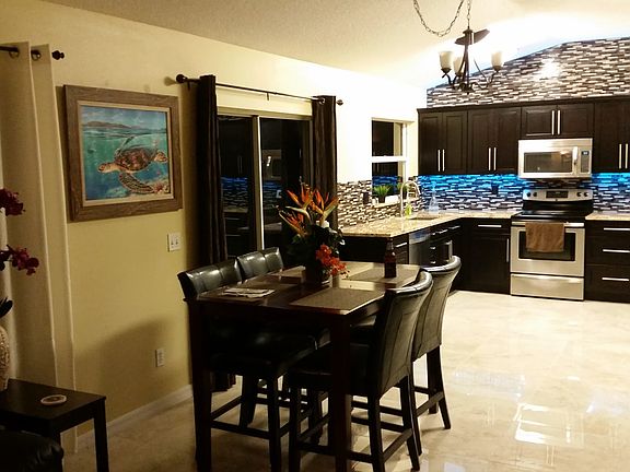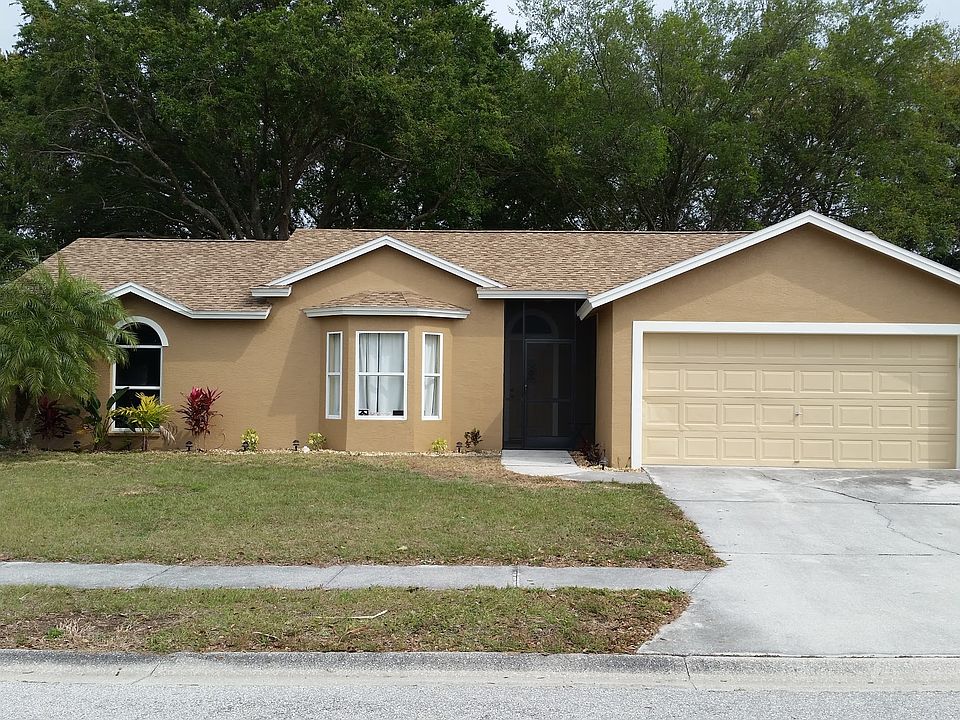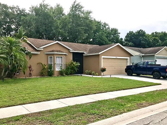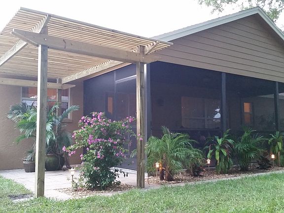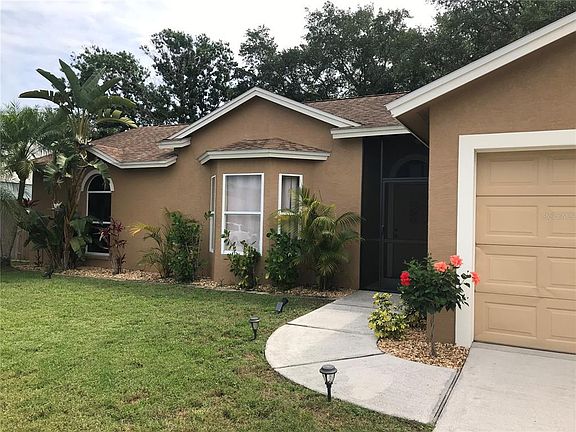 Great home and move in ready! This affordable 3BR/2BA home with vaulted ceilings and a gorgeous updated kitchen with granite countertops, stainless appliances, espresso cabinets with under cabinet lighting, double pantry with roll out drawers and beautiful tile floors. Sliding glass doors lead to a lovely screened in lanai with tile floor overlooking a picturesque fenced in back yard with an arbor and mature landscaping with stately oak trees. Plenty of room for a pool, outdoor fire pit or garden. Spacious master bedroom with en-suite bathroom and walk in closet. Two additional spacious bedrooms, one with a walk in closet and the other with a bay window. No carpet anywhere! No CDD fees and super low HOA fees of $45 per month offering a community pool, playground and tennis court. Fresh Meadows is a pet friendly neighborhood with sidewalks and conveniently located to schools, shopping and activities. Roof is 7 years old, appliances are 6 years old. Multiple offers anticipated so don't wait and let this one slip away.