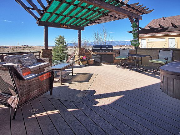 Gorgeous Wolf Ranch ranch home backing to unobstructed mountain views! Why buy a new home and deal with construction noise, traffic and dust when you can have this home with tremendous upgrades and a fabulous location? Upgrades include quartz counters, full tile back splash, hardwood floors, double range convection oven, Bosch dishwasher, refrigerator with hot water dispenser and more! The original homeowners have meticulously cared for this home. You will truly appreciate this home once you walk through the front door! The kitchen includes a composite sink, under cabinet lighting, 42"cabinets, large pantry and a breakfast nook with a built-in bench. The main level laundry room has an elevated platform for a washer and dryer and great cabinets. The oak hardwood floors on the main level shine! You will love the surround sound in the master bedroom, basement, living room and outdoor areas! The master bathroom has elegant marble counters, tile floors and seamless glass shower with tile wall. The walk-in master closet is sure to please with its custom organizer shelves. The family room with 9 foot ceilings is perfect for entertaining with a great wet bar area. Relax on the huge Trex two level backyard deck with a hot tub, beautiful pergola, built-in propane and charcoal grills and breathtaking views! The backyard also includes a nice sitting area for a possible fire pit. Check out the stamped concrete leading from the garage to the backyard. Plenty of storage room. There is a no maintenance concrete backyard fence and easy access to the wonderful walking trail behind the home. Fully finished three car garage with a spotless epoxy floor, slat and steel wall organizers and bike storage system. Stay cool on hot summer days with the central air system. Prepare to fall in love!