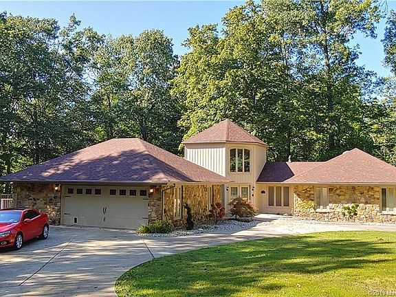 Benchmark Manor - A unique home in a quaint woodland setting, seconds from FCHS, minutes to downtown Louisville. The secluded neighborhood boasts a walking trail to Mt. St. Francis. Sprawling home offers 4 or 5 bedrooms with 4-1/2 bathrooms and attached 2 ½ car garage. Gourmet kitchen with circular dining area, granite counters, island with cooktop + 2 ovens, opens to a family room with fireplace and hardwood floors, as does the formal living and dining area. Intriguing turret room makes a great 5th BR- up to a spiral staircase to a charming room with a full bath, closet, window, and skylight. Spacious, newly remodeled master suite features double tray ceiling and recessed lighting, nice walk-in closet, second closet with custom shoe shelving. Master bath features stone, porcelain, and granite surfaces including double vanity, custom tiled shower, enchanting overflowing whirlpool with air and water spa jet systems, chromotherapy lighting, aromatherapy system, and kinetic heat. Main and lower level laundry rooms. Enjoy the outdoors on one of many outdoor patio spaces, or cool off in the 20 x 40 inground heated swimming pool. Generous walkout accommodates a living area, billiard area, bar/entertaining area, and utility garage. Custom built, many extras: New roof (4/19), central vac, all-electric (2x200 amp service), and Alexa intercom. Smart home with Blackhawk + home hub to enable the Apple HomeKit features to remote control and set up home automation on many lights/devices.