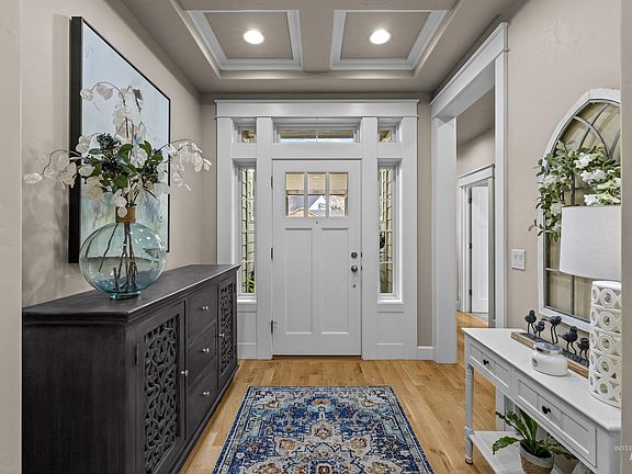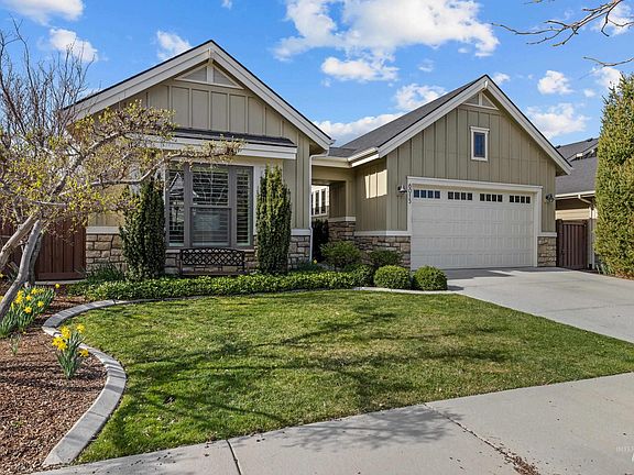 Nestled in the highly sought-after River Heights Community, this charming single-level home offers an idyllic lifestyle. Situated within walking distance of the Boise River, Greenbelt, & scenic foothill trails, it presents an enviable location. The spacious & vaulted great room sets the stage for entertaining, seamlessly connecting to the kitchen boasting an expansive island & custom white cabinetry with slide-out drawers. Upgrades abound, including plantation shutters, custom blinds, new carpeting, & a speaker system in both the great room & patio. Enjoy extended outdoor living on the covered back patio, complete with remote-controlled shade & awning covers. Convenience is key with retractable screens on both the front and back doors. The master suite boasts built-in drawers for added storage. The open & split-bedroom concept ensures privacy, with a separate guest wing & flex space. Finally, the oversized garage is a homeowner's dream, featuring built-in cabinetry & space for a workbench.