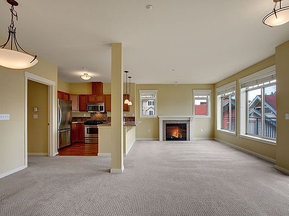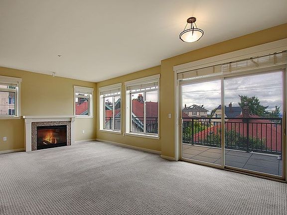 Roycroft Condo , 2 bed , 2 bath , West facing 2nd floor with wrap around deck . Great room plan with living, dining, kitchen, flex space. Quality finishes, tile, hardwood, granite, painted millwork, solid wood doors, 9 ft. ceilings, fireplace, gas cooking. Expansive windows look to neighborhood vistas Spectacular Sunsets. Neighborhoods eateries, shops, Fresh Flours Bakery in building, woodland park across the street. Fast Access to Highway 99,1-5, Greenlake, Fremont, University ,Easy north or south commute and to downtown. Reserved garage parking, bike storage. Tenant only pays electricity and internet/ cable. Available 6-29-13.