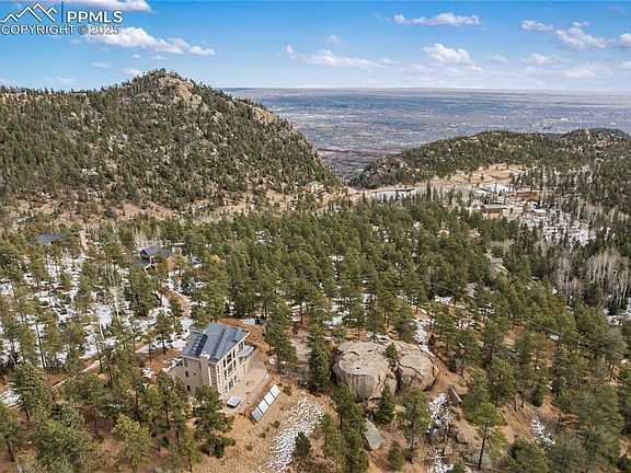 Perched high in the mountains where the sky feels closer and the noise fades away, this modern mountain sanctuary is the definition of elevated Colorado living. Thoughtfully designed to blend luxury, sustainability, and jaw-dropping natural beauty, this home delivers a lifestyle that feels both indulgent and intentional. From the moment you step inside, panoramic views steal the show—framed by a dramatic 19-foot wall of windows that floods the open main level with light and mountain majesty. High-end maple cabinetry, doors, and refinished cascading natural pine stairs, flow seamlessly throughout the home, paired with quartz countertops and LG stainless steel appliances that anchor the kitchen in both style and function. Step outside to the expansive main-level concrete deck, perfectly positioned for entertaining, sunsets, and star-filled evenings. The upper-level primary retreat is nothing short of spectacular, featuring three private terraces with 360-degree views of the Western Rockies and Southern Colorado. A spa-inspired bath with a deep Jacuzzi tub, walk-in closet, and convenient laundry completes this luxurious escape. Built for year-round comfort with warm radiant floors and complete energy efficiency, this home is truly ahead of its time—producing as much energy as it consumes. State-of-the-art solar, an advanced air-exchange system, EPA-certified Heatilator fireplace, superior insulation, and airtight Milgard windows ensure it stays cool in summer, warm in winter, and efficient always. Located in Crystal Park, a private gated community spanning 2,000 wooded acres, residents enjoy trails, creeks, springs, wildlife, a stocked trout pond, clubhouse with pool, and full HOA services—including road maintenance, snow plowing, security, and more. All this, just 15 minutes from Manitou Springs and 30 minutes from downtown Colorado Springs. This isn’t just a home—it’s a self-sustaining mountain lifestyle with front-row views of Pikes Peak.