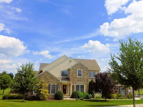 Elegant, stunning stone accented end-unit town home in the desirable, sophisticated Penns Meadow subdivision. *Open Concept* design, 1st floor MBR suite (2-WIC, shower, soaking tub), 2-1/2 baths, spacious kitchen with large breakfast bar, plus a *family over for the holidays* sized dining room. 2nd floor with 2 additional full sized BRs and loft area. Lots of storage plus a full basement and oversized 2CG. Open 2 story entrance foyer, hardwood floors, 11 plus foot ceilings, circle top windows, skylights. Lots of natural light. Warm, cozy and economical gas heat, hot water and central air. Situated on a large well landscaped and manicured grounds (maintained by the HOA) bordering and overlooking Brookfield Lower Macungie Park from the rear deck. Central but rural location near the Lehigh Valley Health Network medical center, Air Products and Chemicals, I-78, PA Turnpike, Route 22 and public transportation.