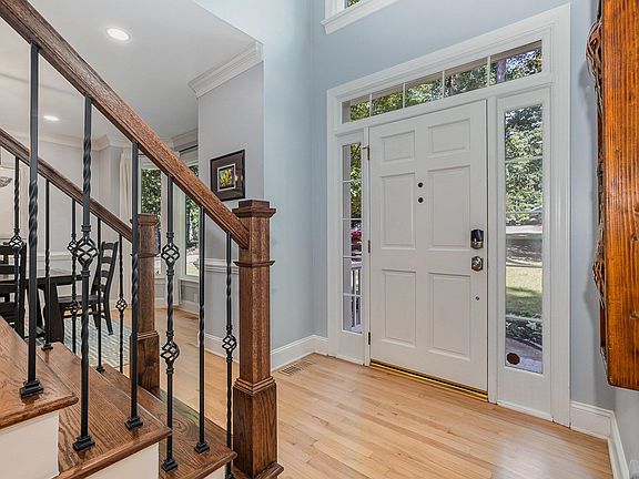 Welcome to 6016 Mistyridge Rd in Holly Springs! This 1994-built stately residence offers the perfect blend of timeless elegance & modern updates & sits on a 0.95-acre lot with rare Bass Lake views. Inside, discover elegant living spaces, a renovated chef's kitchen, breakfast nook overlooking the lake and a cozy family room with a fireplace & custom built-in, dedicated office & formal dining. Updated lighting, hardwood floors throughout & modern finishes add to its charm. Upstairs, enjoy a spacious owner's suite w/ updated ensuite bath, three bedrooms, bonus room & unfinished 3rd floor. The large beautifully landscaped yard with a screened porch, deck, and firepit offer serene lake views. Updates include fresh bath, new floors, remodeled baths, new windows, & a fully remodeled kitchen. Practical enhancements like a new roof, water softener & so more are added bonuses. Enjoy leisurely strolls & outdoor adventures with access to the walking trail around Bass Lake. This home is meticulously maintained and ready for new owners. With NO HOA & NO city taxes, don't miss this opportunity to make it your forever home!
