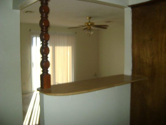 3 bedrooms, 1 1/2 bathrooms, living room, kitchen/dining room, breakfast bar, refrigerator, electric stove, dishwasher, garbage disposal, ceiling fans in living room and master bedroom, partial carpet/vinyl flooring, washer/dryer hook-ups, patio, chain link fence CHA-gas 2 Car w/ opener & 1 remote. **NEWLY REDONE
