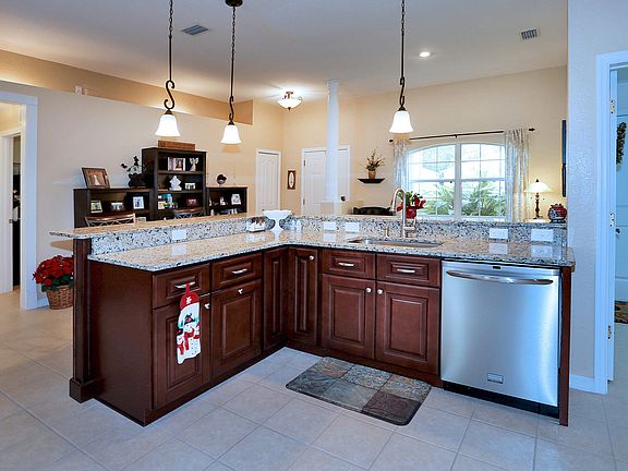 Updated & Move-in Ready! Renovated with an open floor plan desirable today. This home is not just stylish but celebrates its own version of simplicity with clean lines & cool, neutral colors, the perfect calming influence for this sleek layout. An open floor plan means that rooms really must blend with one another in their design. The tile flooring flows throughout each room; a rectangular rug in the dining area manages to create a dining room without adding any walls. Kitchen features cherry cabinetry, tiled backsplash, granite & stainless appliances, along with an angle designed breakfast bar separating the living area. This home has perfect flow for entertaining & the Florida Room increases your livable space, providing year-round enjoyment & accesses the private back yard & patio