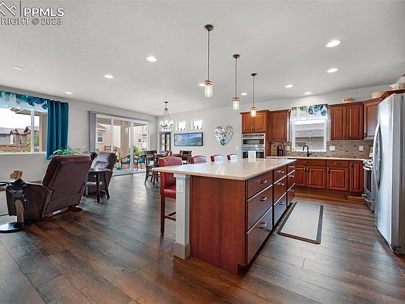 This One-Of-A-Kind Custom-Built Ranch-Style home has beautiful Front Range Mountain views. This spacious home sits on a cul-de-sac, and features an Open-Concept Kitchen, Dining and Living space. The main-level has 9-ft ceilings, 8-ft doors, plenty of natural light, a gourmet kitchen with quartz countertops, 2 Ovens and a 9-ft quartz island with pull-out drawers; Living Room has a wall fireplace and walk outside to the patio through the Dining Room. The large main-level master has a 5-piece ensuite which includes a Zero-Threshold Large Shower & huge walk-in closet which adjoins the Laundry Room. The Basement offers 9-ft ceilings, 2 large bedrooms, a full bathroom, 2 family room areas, a wet bar & a huge storage area. The 3-car garage is fully insulated & drywalled plus the floor has been sealed in non-skid PolyUrea. The 6.3 KW Solar System & SolarEdge Inverter are owned and includes a Type 2 EV Charger. The yard has been professionally landscaped and has a concrete split rail fence with additional dog fencing. Easy access to Powers Blvd, I-25, Hwy 83, the Air Force Academy & is close to Entertainment and Restaurants and plenty of Shopping along the Powers & Interquest corridors. Don't wait, come see this home today for it won’t last long!