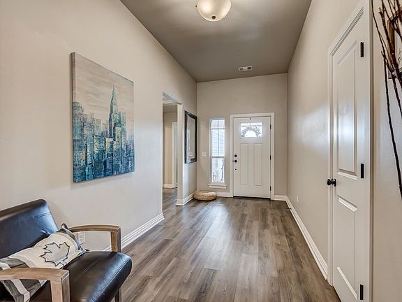 Better than new in a wonderful neighborhood! KIRTZ wooden shutters are throughout the home. Gorgeous curb appeal with established landscaping and a darling covered front porch to enjoy the day outside. This three bedroom, two bath is move in ready with a great floorplan. It has wonderful choices of colors that will go with many styles and tastes. The large entry/foyer leads to the living area. It has tall ceilings and a gas fireplace with stylish tile. It joins and is open to the kitchen and dining area. The kitchen has quartz countertops, stainless appliances, an island with an eat at bar, a walk in pantry and under counter lighting. It has a locker system / coat rack just off of the kitchen. The laundry room has cabinet storage and a closet with shelf storage. The isolated primary bedroom is located at the back of the home with high ceilings. The primary bath has a walk in tile shower, walk in closet, two sinks and storage. The back features a covered back patio and a privacy wooden fence. The garage has added shelving that will remain with the home. This Ideal home is energy efficient.