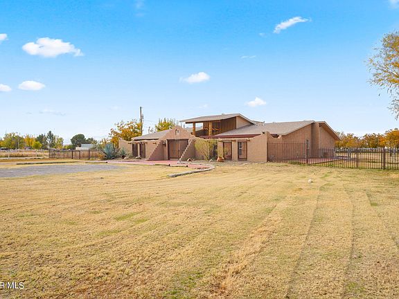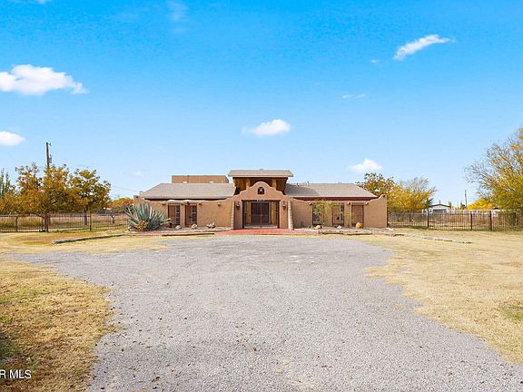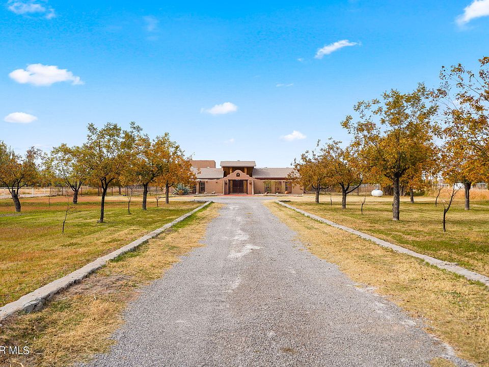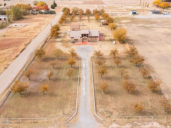 Nestled in a Pecan Orchard this 2.61 acre estate hacienda offers beautiful peek Mountain View's. Located on a peaceful street in El Paso's bustling Upper Valley with nearby easy access to I-10. Featuring multiple living rooms, 4 bedrooms and 3 baths + 3 car garage with upstairs studio that could be used a home office or gym. Custom vibrant kitchen + butlers pantry and utility room. Several updated baths, Terra-cotta tile, Vigas, stone fireplace, imported chandelier from Mexico, custom window treatments. Amongst 69 pecan tress, multiple areas for pets or farm animals, and three sheds equipped with electricity. Horses are allowed and you have access to irrigation rights ($300/yr). 1 horse power reliable plumbing Sewage lift pump. City water filled in septic tank. Roof 2022, Dual Paned Windows 2017. Upgraded electrical and exterior lighting with motion sensors. Easy care concrete around the perimeter. So many possibilities for this rare jewel. Call for detailed extras this estate offers.