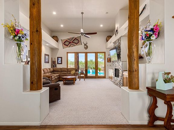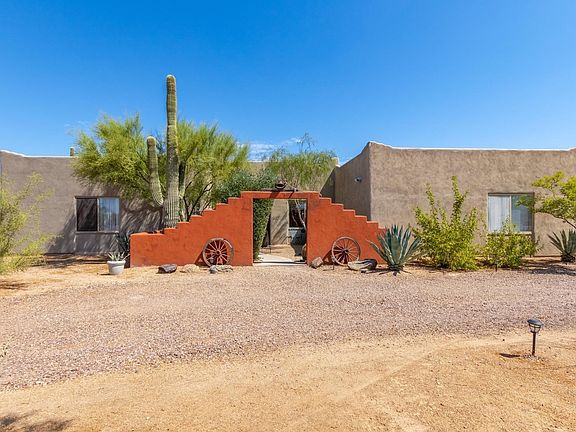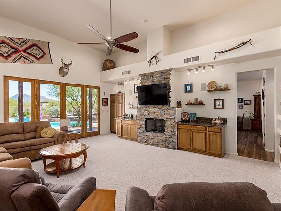 Welcome home to this desert oasis on 1+ acre. Single level living with courtyard entry. Stylish entertainment area is a delightful focal point w/stone fireplace & art shelves. Kitchen has walk in pantry, quartz counters & butcher block island, newer 5 burner cooktop & tons of storage. Formal dining is spacious enough to add a bar area. Bedrooms are HUGE. Double door den is bigger than most bedrooms. Master has patio exit, large stone shower & separate garden tub. Backyard pool is OHHHH so inviting & adjacent to built-in outdoor BBQ & bar area. Step down hollow is perfect for your hot tub or play area. Outside surround sound. Saguaros front & back. Mountain View's abound. North facing backyard. Horse property, but no set up. 3 car garage. So many extras. Must see.