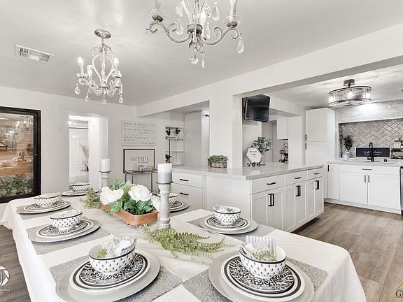 Business friendly Ranch style property centrally located on almost 3/4 of an acre, perfect for large animal lovers or automobile enthusiasts. Outside is all Country with a 3-bay shop and built-in car lift that includes a 60-gallon air compressor, and 240V, 2-car parking garage with additional storage. RV parking + dump station. Once you walk-through the door it's modern, fresh and new. The Dream kitchen has it all quartz countertops, crushed granite sink, Samsung appliances, kettle faucet over stove, crystal chandeliers, and of course easy clean vinyl flooring. The large living room is perfect for family movie night or entertaining your best football buddies. Smart tv's mounted throughout the home are included in the sale. The large shed next to the covered patio has been nicely converted into a 1 bedroom, 1 bath guest house with all the comforts of home. Guest house might also work well as a Jr. ADU with some modifications (Buyer to verify) Horses & Chickens Welcome!