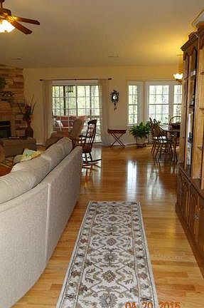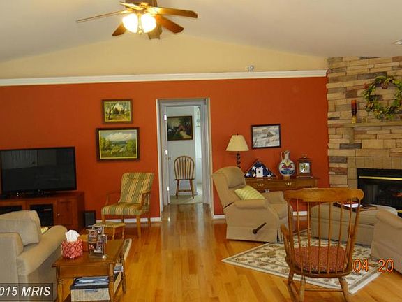 Waterfront community! 5+ acres of wooded privacy surround this all-brick rambler w/ full basement. Enjoy one-level living, open floor plan, gourmet kitchen w/granite, fireplace w/stone surround, & screened porch w/deck. Attached one-car garage & HUGE 30x36 detached garage is mechanic's dream! Deeded boat slip INCLUDES a pontoon boat! Largest lot in the community. PAVED, circular driveway!
