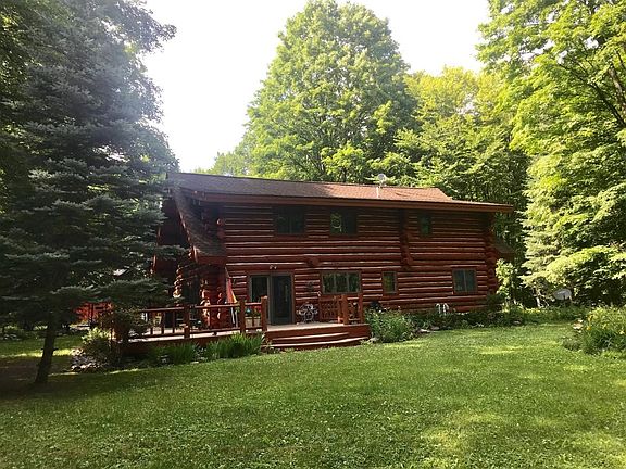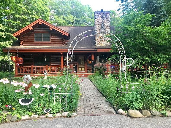 Straight out of a fairy tale and located at the end of a long, blacktop drive, you'll find this full log home surrounded by lush wildflowers and 32 +/- acres of mature hardwoods. A grand, rustic interior with cathedral ceilings, log beams and staircase, a stone fireplace and an abundance of windows providing plenty of natural light and nature views. 3 bedrooms include a master suite plus a large loft offers living space for many. A fully functional apartment is located above the 30x40 barn and workshop providing 1 additional bedroom, full bath, kitchen and laundry. Most furnishings, tractor and gator negotiable. Generator, alarm system, central AC - no detail missed! Truly a picture perfect property that defines what it means to be 'up north!'