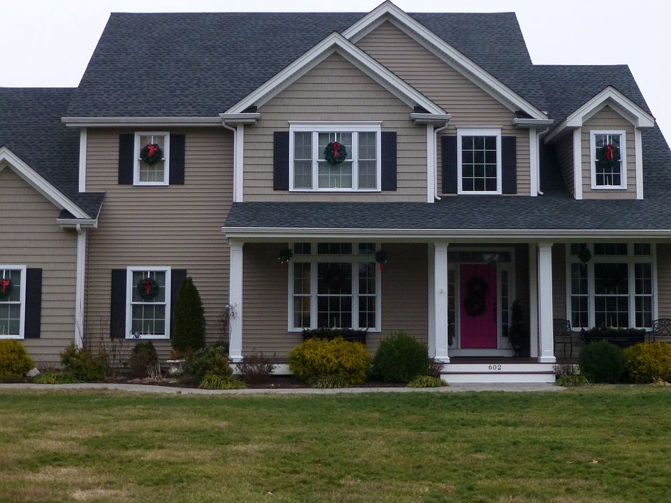 Classic colonial with covered composite deck on front porch and composite deck in back stepping down to a large stamped concrete patio surrounding large in-ground pool.