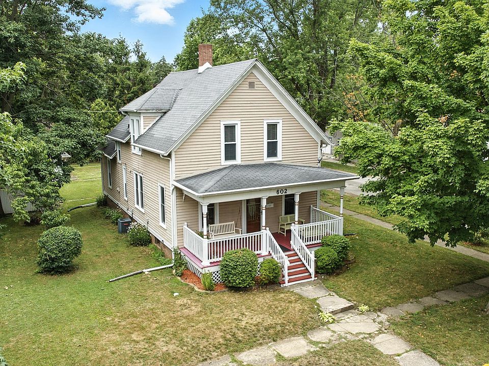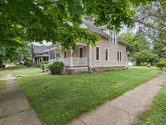 Historic Charm Meets Everyday ComfortThis beautifully preserved historic home offers timeless character and modern versatility in a spacious, inviting layout. From the moment you step onto the charming front porch, you'll feel right at home. Inside, you'll find stunning original woodwork, soaring 9-foot ceilings, and classic French doors leading into a formal dining room--perfect for hosting or everyday living. The large kitchen features warm Hickory cabinetry, a functional island, and ample room to gather. With 3-4 bedrooms and 2 full baths, the layout offers flexibility to fit your needs. Two additional rooms on the main floor provide options for a fourth bedroom, home office, or cozy den. Upstairs, three spacious bedrooms and a full bath await. The clean, dry basement adds even more potential, while the generous corner lot and detached 2-car garage complete the package. Brimming with charm and space in a desirable location--this is one you don't want to miss! WELCOME HOME!