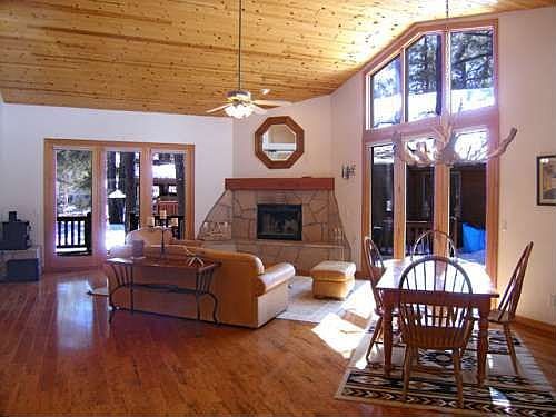 The new solid wood floors, cathedral ceilings, stone fireplace and many pines create a cozy, woodsy feeling in this 1718 sf Aspen Cottage in the heart of Forest Highlands. Designed for family and friends, in addition to two large bedrooms and 2 bathrooms, a third room is easily used as or third bedroom (it has a closet and entry to the bathroom), office or rec-room. The floorplan flows with a spacious kitchen and wide open greatroom, all flooded with light from a wall of windows on one side, and from the doors to the wraparound deck on the other. Cozy up to the fireplace or drink and dine in the trees. Located at the end of the cul-de-sac, you can walk to the Canyon Clubhouse, Driving Range and Tennis Courts. The wood front porch (perfect for rocking chairs!) completes the cabin in the woods feel, with all of the amenities of Forest Highlands. A wonderful value!