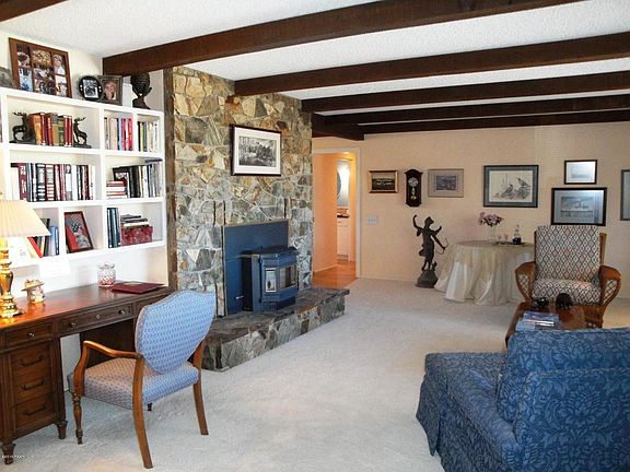 Charming immaculate home in great location, warm inviting living room, w/pellet stove/fireplace insert with natural stone , formal dining room, large breakfast bar, beautiful open kitchen w/solid surface counters, fresh white cabinets w/Cape Cod style cabinet fronts, all appliances stay, including Freezer in gar., open great rm. on back of house overlooking large deck giving extra are to relax, upgraded bathrooms w/granite & tiled shower, real natural oak floors, lge laundry rm. can double as sewing or hobby rm., great views from deck, large front yard landscaped.