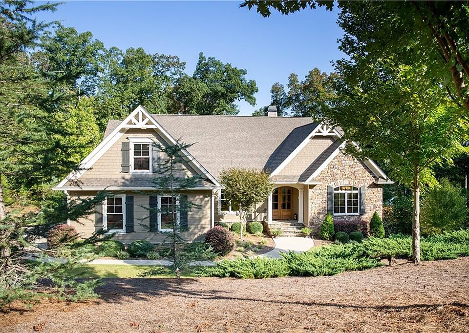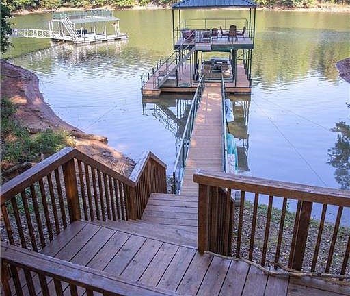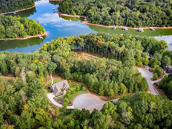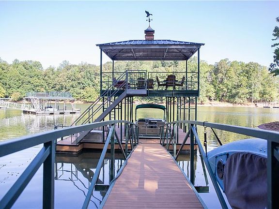 This waterfront destination is situated inside a calming cove and located at the end of a cul-de-sac. This home embraces a yard of manicured nature found in the foliage of the stunning mixture of trees, the green grass, seasonal mountain views, and the landscaping with the decorative and useful landscaping boulders. As you stroll down your sidewalk, you will find the newly painted, warm taupe, cement planks working harmoniously, complementing the real stone exterior finishing. Inside, 602 Keswick Point opens to the Great Room anchored by an authentic stone fireplace, vaulted ceilings with impeccable quality beam work, and white oak hardwood floors throughout the main level. Visually open, the kitchen features a large eat-in island with custom made Maple cabinetry and custom Ogee edge granite countertops found throughout the home, plus stainless steel appliances. The kitchen also features a tilt-out window that brings in an abundance of natural light and is fronted by the stainless steel sink. The main level master suite features a tray ceiling, captivating lakefront views, and access to the screened-in porch where you can enter a peaceful world of nature. The spacious en-suite includes double built-in custom Maple cabinets and vanities with the custom ogee edge granite, a tiled shower, a relaxing jetted tub, and his/her walk-in closets. Down the hallway, passing one half-bath, the two-car garage, and large laundry room leads upstairs to a sizable suite that could occupy as a media room, office space, studio, or bedroom - with a spacious closet. Proceeding down to the walk-out basement, you will find gorgeous natural lighting overflowing through the glass doors and carpeted flooring. The basement highlights a second kitchen, multiple storage spaces and closets, a full bathroom with granite countertops, and two spacious bedrooms. Outdoors, a covered terrace overlooks the dense and richly grown grass, leading to a fire pit area that sits just below a lovely staircase made of added decor boulders. Finally, a cement sidewalk/golf cart path escorts you down to your two-story covered dock with plenty of room to entertain guests and storage space. The dock also features composite decking, a hip roof, and electricity/water ran to the gang walk.