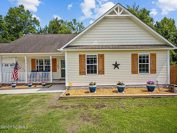 MULTIPLE OFFERS! FINAL & BEST DUE BY 3PM WED. 6/21! Well maintained 3 bedroom 2 full bathroom home in the desireable neighborhood of Thompson Farms! Outside of Jacksonville city limits (low taxes!) yet still close to New River Air Station, Camp Lejeune and Stones Bay. The house is situated in a culdesac on a large lot with a fenced in back yard and nice back deck for relaxing. Beautiful custom cedar shutters and covered front porch welcome you to the front door. Gorgeous LVP flooring throughout the open and spacious living room flow into the kitchen and dining area that's complete with LVT flooring. The kitchen has lots of cabinet space and a huge island for extra counter space. Make your way down the hall to three large bedrooms. The primary bedroom has trey ceilings and attached full bathroom. The two other large rooms share a full hall bath. Don't miss your chance to call this house HOME!