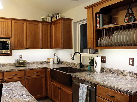 Home shows like new...perfect family home! 3 Bedrooms, 2 bathrooms, Large 15x20 family room upstairs. Copper barn sink, stainless steel appliances, breakfast bar, plenty of counter and cabinet space for those that like to cook or gather in the kitchen/great room. Built in Dish storage and buffet. Master Bedroom on the main level, carpeting only in the upstairs loft area, home is completely fenced in the front and back. Large storage shed, landscaped with grass in the front. Built in BBQ outside with a Covered Patio, home is all electric, blackout custom blinds, vinyl windows, home was completely rebuilt in 2007.