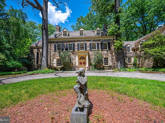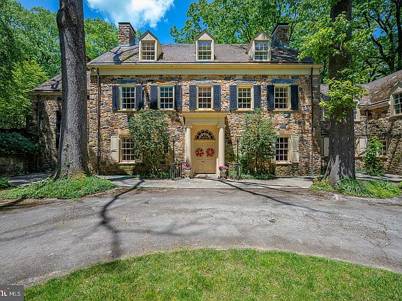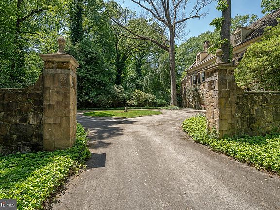 Wayne, 19087. Rare offering. A highset 6+acre 1920's estate compound with the ultimate luxury of total privacy. Georgian Colonial manor house and estate sanctuary has wild, forested woodlands, formal, sunken gardens, tennis court, and pool w pool house, none of which can be seen from the street. The long drive leads to a delightful, walled court yard with circular drive at front approach to the manor house, a grand Pennsylvania fieldstone colonial of approximately 9,000 square feet. The manor house has endless 1920's scale, elegance and amenities, including the barrel-vaulted transverse entrance hall, formal step-down reception rooms with soaring ceilings and fireplaces, quarter sawn hardwood floors, a graceful spiral stair rotunda, hand-paneled library, breakfast room and dressing room of tiger maple, a hidden cloak room and service bar for entertaining and spacious outdoor covered and open patio spaces, all with incredible views. This family compound includes a detached, four car heated garage with a chauffeur's two bedroom apartment above with full bath, laundry and kitchen. Swimming pool and poolhouse has dual changing rooms, bathrooms and a kitchenette.