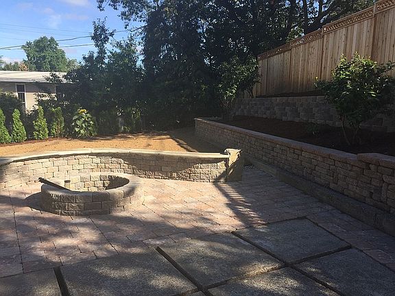 b. Backyard: Two tier brick retaining walls, cedar fence in back yard, brick fire pit w/wrap around seating bench, artistic patio and barbecue outlet.
