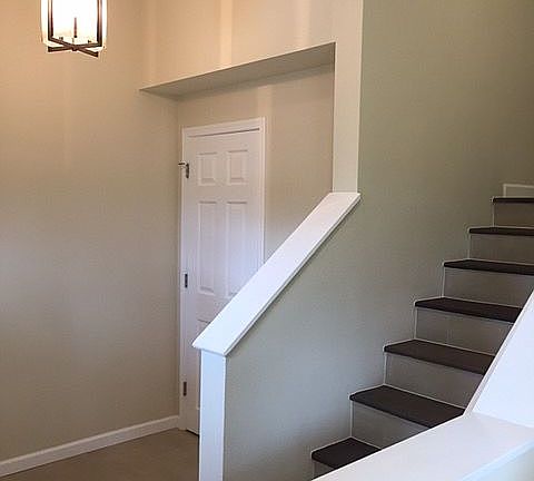 1. New front addition offers split entry for easy access to upstairs main living area and downstairs family room. Pendent light with matching sconce and heated tile floor. Custom designed cement and tile stairs to main level and down to family room.