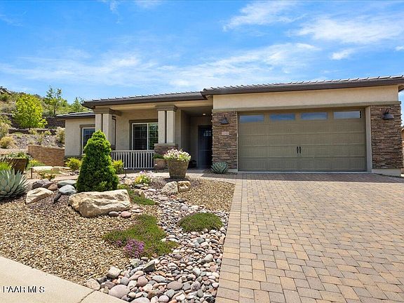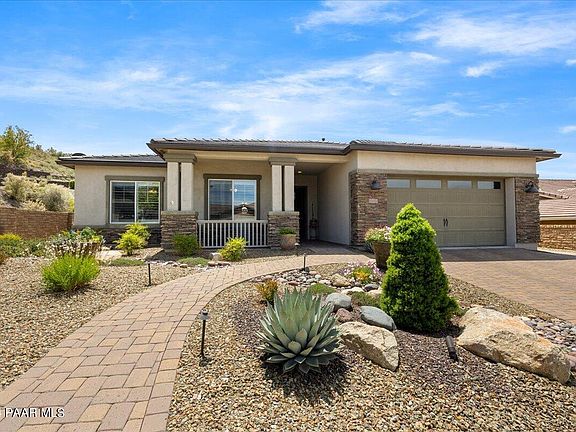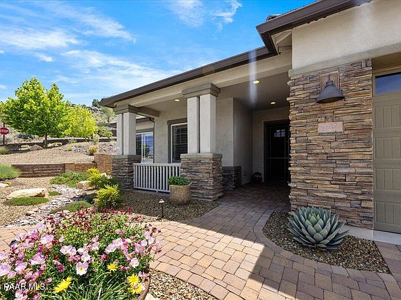 Gorgeously appointed Prescott Lakes home offering: 3 bedrooms, 2.5 baths, private corner lot with views, lush landscaping in front and back, largecovered patio with pavers and outdoor dining area with pergola. Open floor plan with huge glass doors bringing the outside in. Gourmet kitchen with abreakfast island, granite counters throughout, dining area and huge walk-in pantry. Spacious laundry room. Stone fireplace with custom mantle.Upgraded electrical and lighting. Owner's suite with room for an office, his and her vanities and garden tub with a separate snail shower. Planked wood looking tile floors throughout. 10+ ft. ceilings. Epoxy floor garage with workbench. Views of Granite Mtn and city lights.